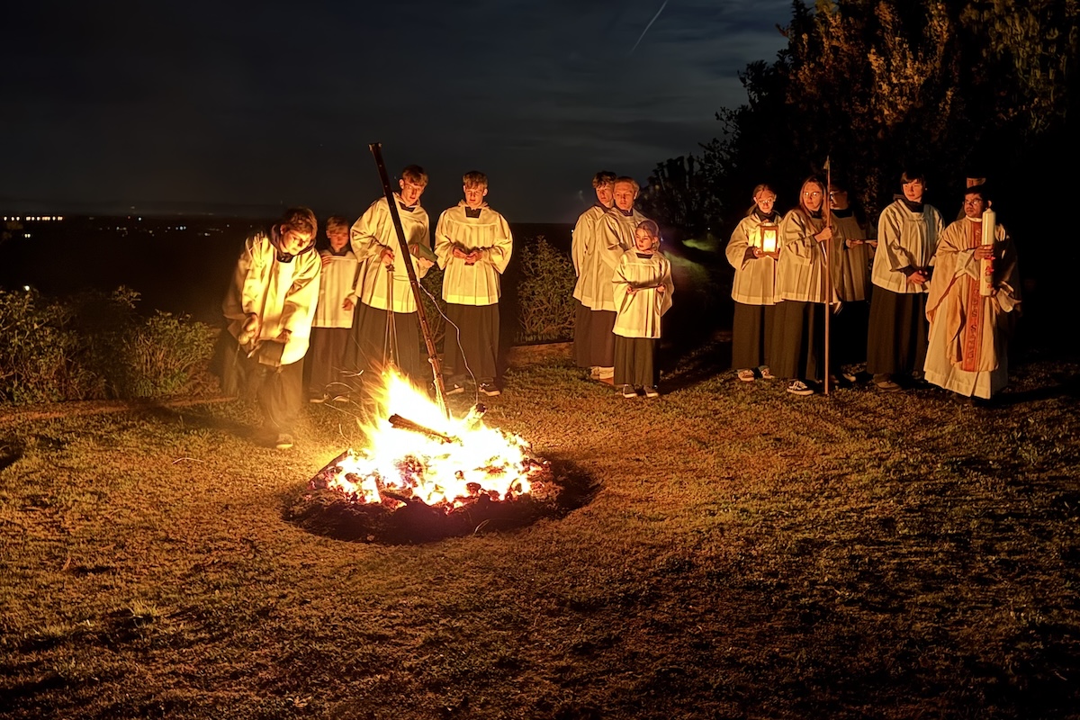 Geleitet wurde die Zeremonie von Kaplan Ravi Mundlapati, der mit den Messdienern die Osterkerze segnete und – auch wenn der Wind es ihnen nicht leicht machte – entzündete. Gemeinsam mit der Kirchengemeinde ging es dann in die dunkle Kirche zur Eucharistiefeier, bevor der Tag anbrach und mit einem gemeinsamen Frühstück im Luisenstift begrüßt wurde.